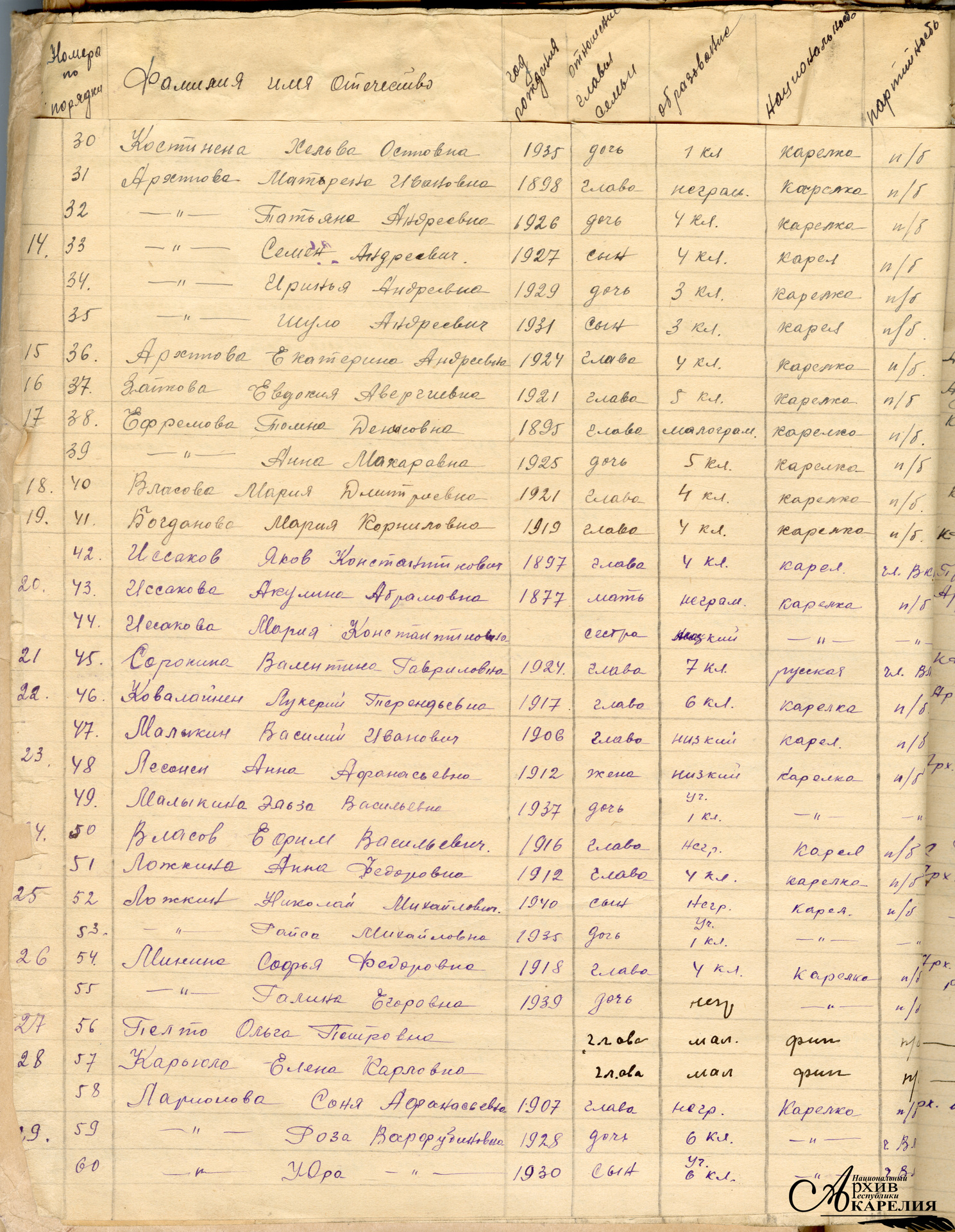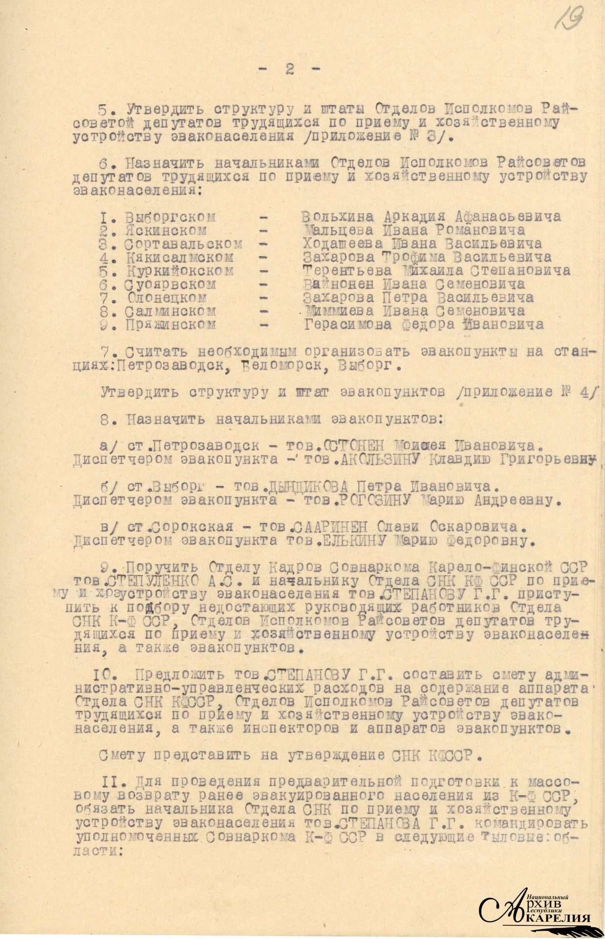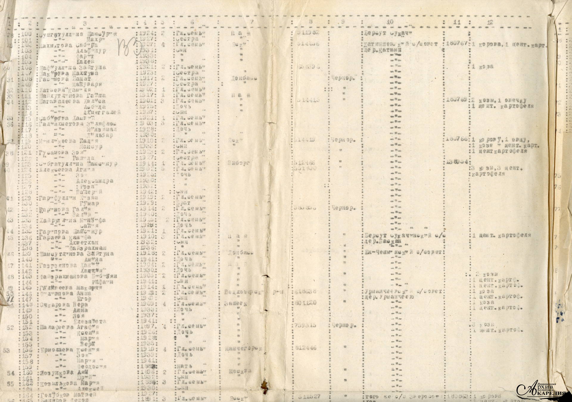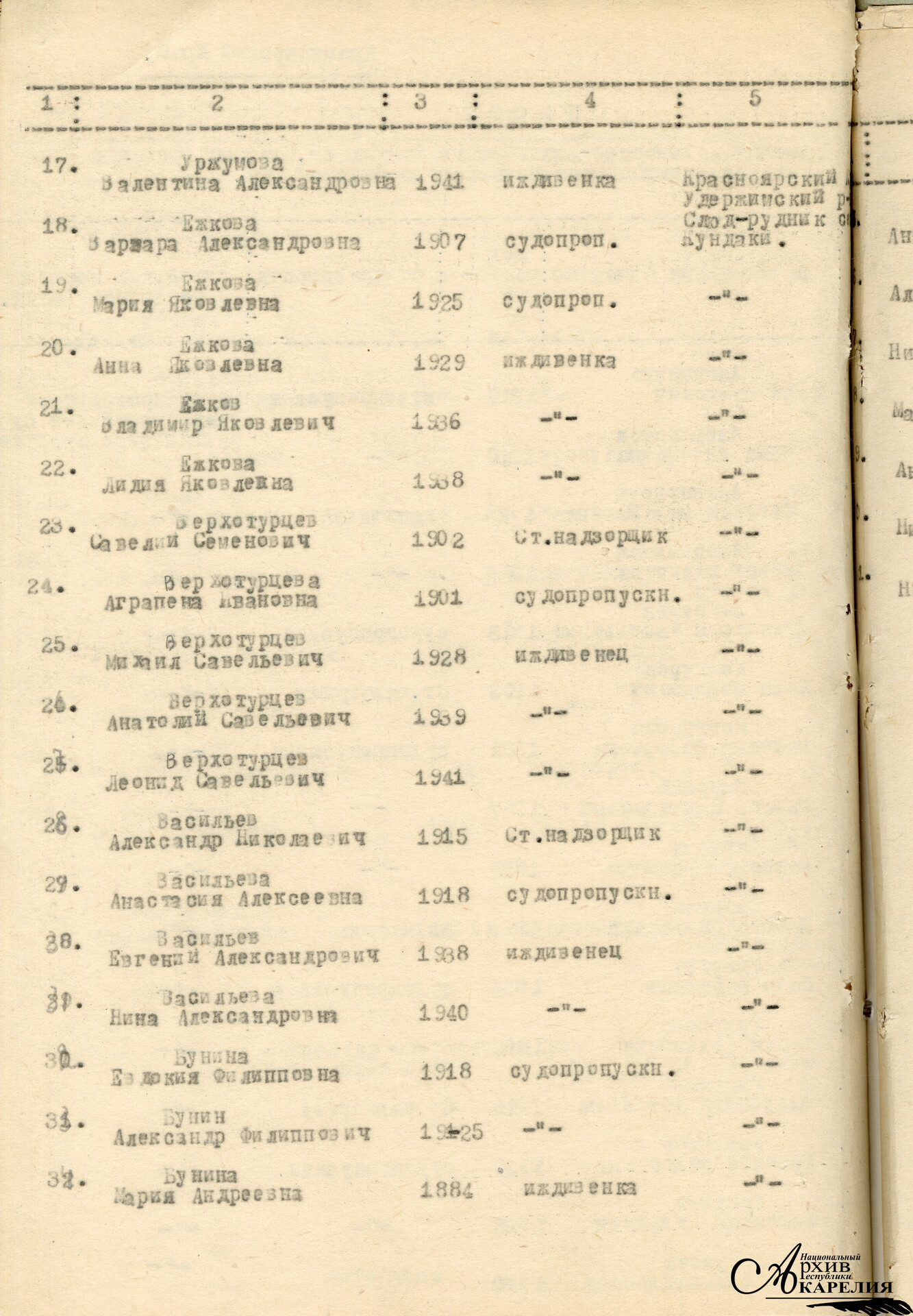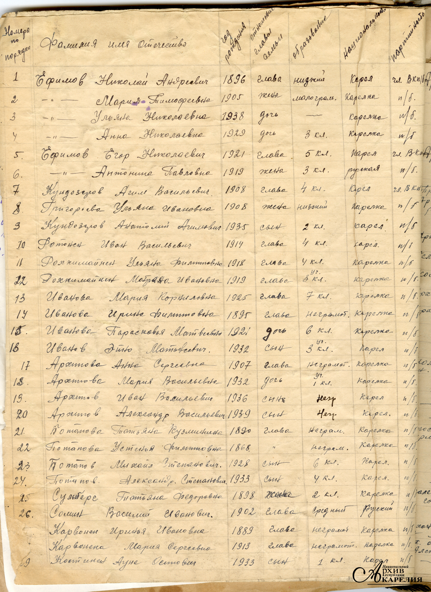 Список специалистов сельского хозяйства (агрономов, механиков, ветврачей), эвакуированных из КФССР и проживающих в Ярославской области, составленный уполномоченным СНК КФССР по Ярославской области Вайноненом для подготовки возвращения в КФССР.