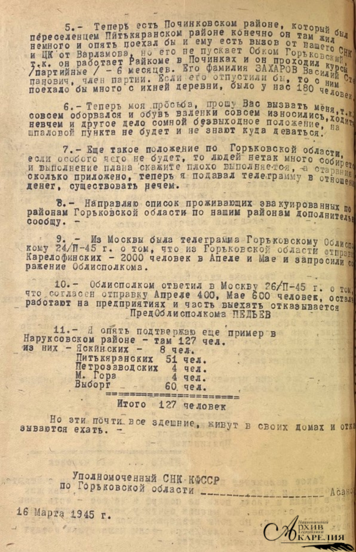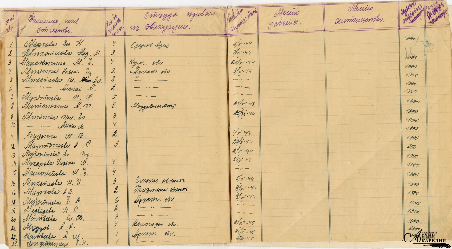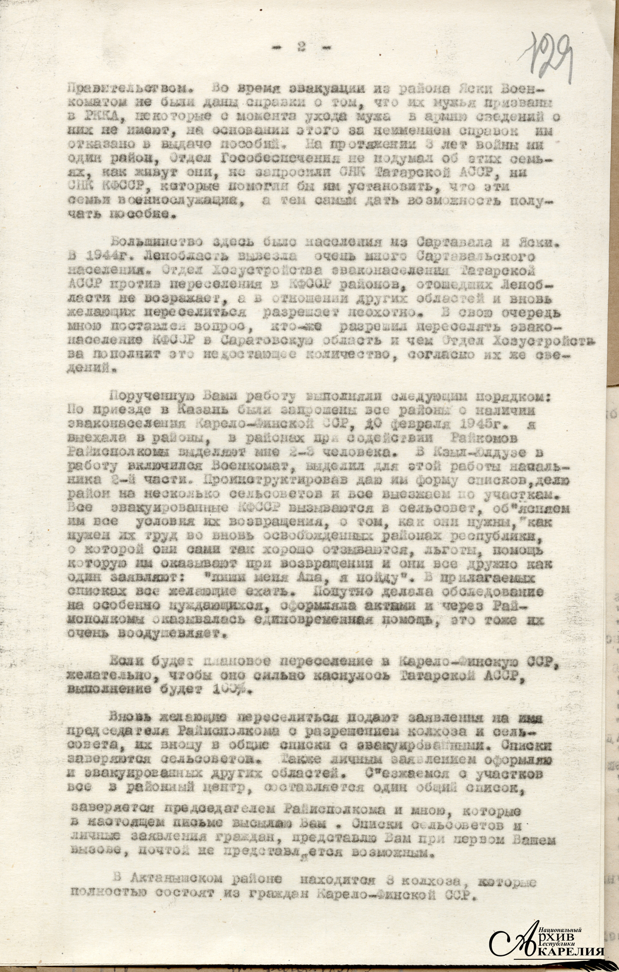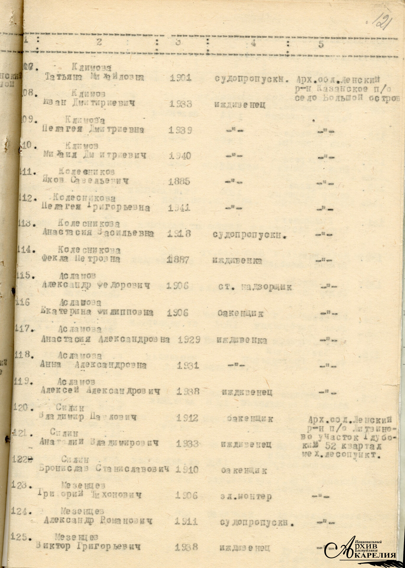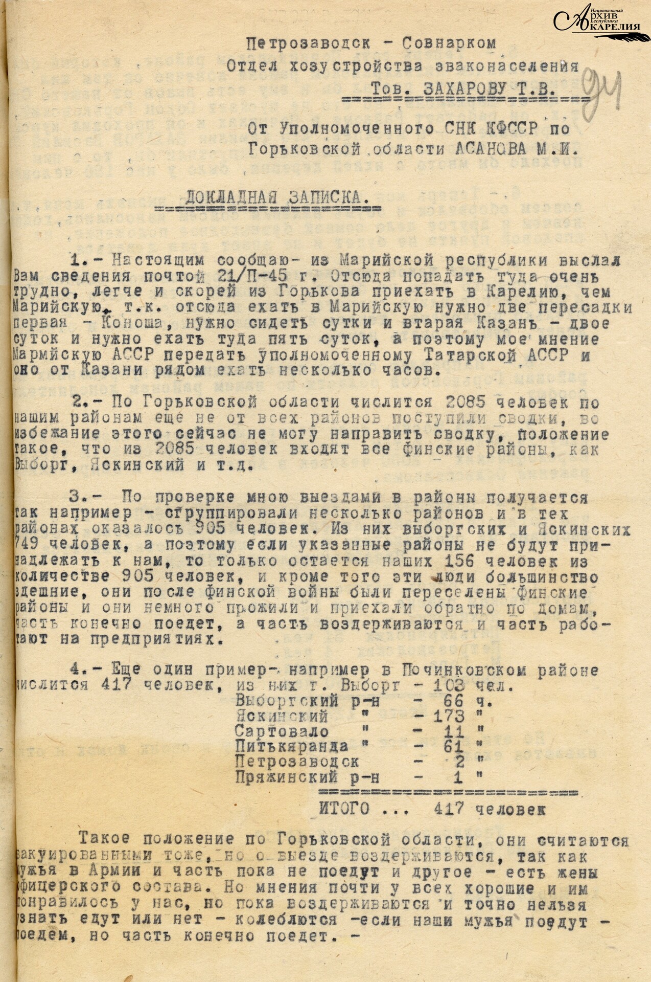 Список специалистов сельского хозяйства (агрономов, механиков, ветврачей), эвакуированных из КФССР и проживающих в Ярославской области, составленный уполномоченным СНК КФССР по Ярославской области Вайноненом для подготовки возвращения в КФССР.