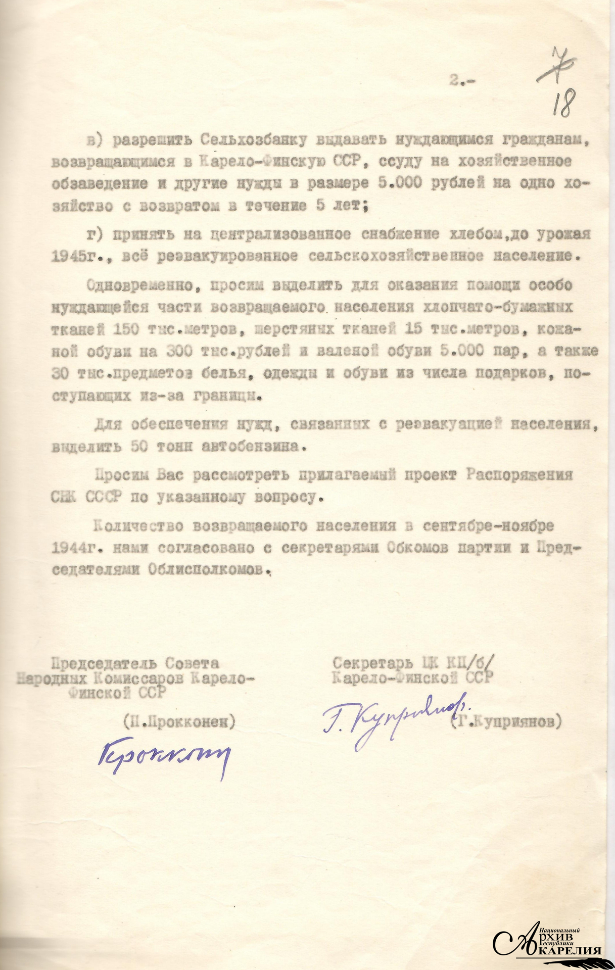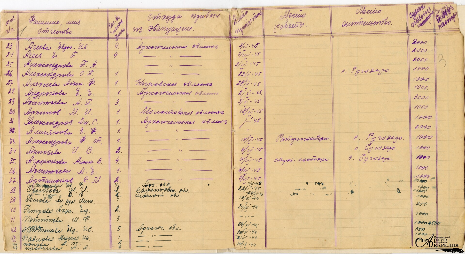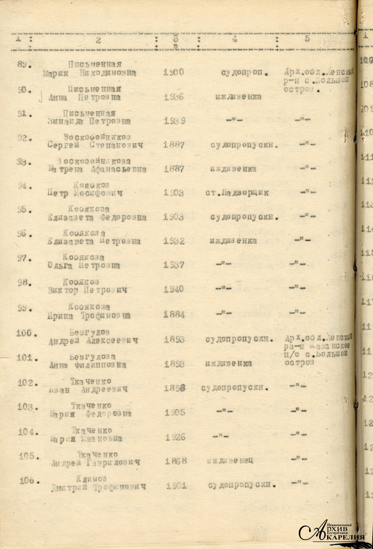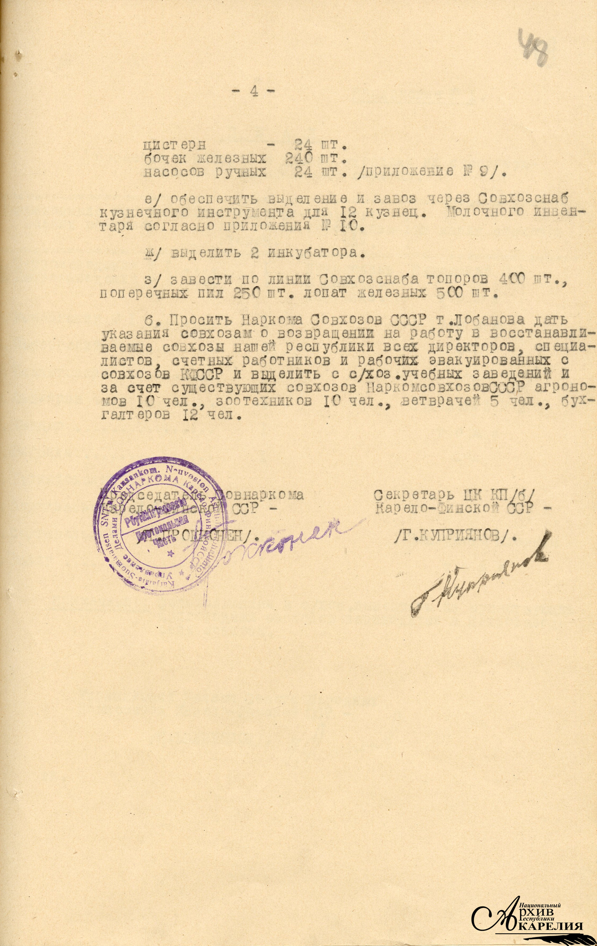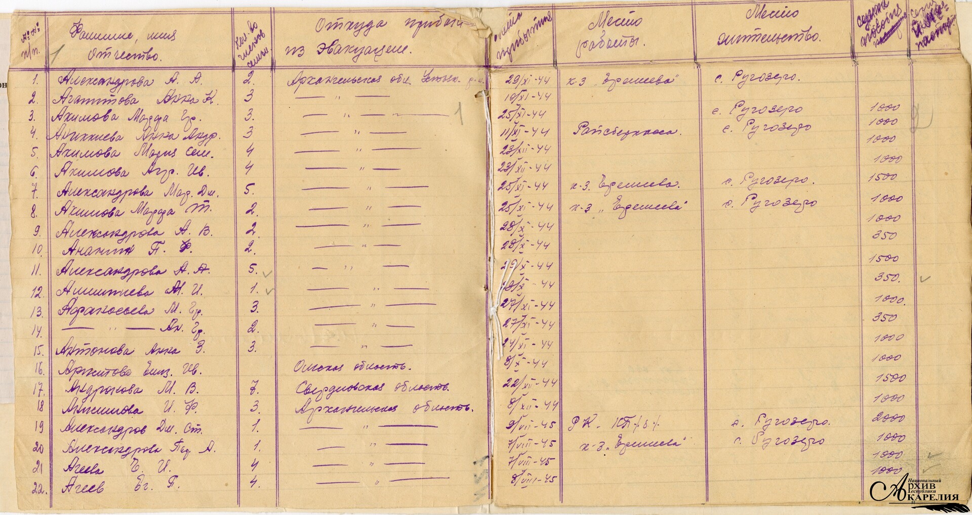 Список специалистов сельского хозяйства (агрономов, механиков, ветврачей), эвакуированных из КФССР и проживающих в Ярославской области, составленный уполномоченным СНК КФССР по Ярославской области Вайноненом для подготовки возвращения в КФССР.