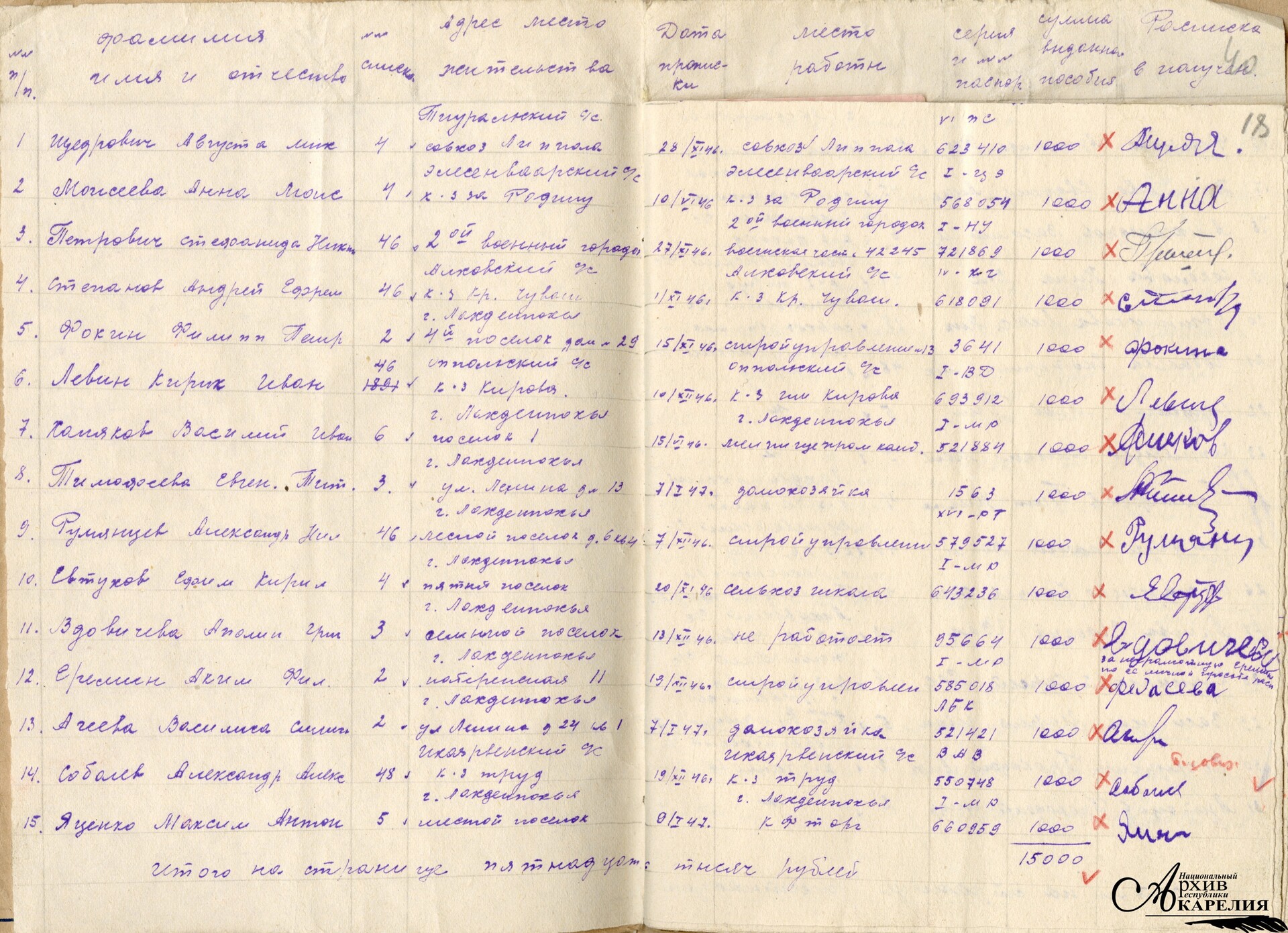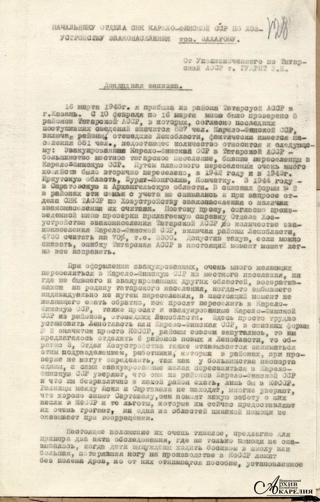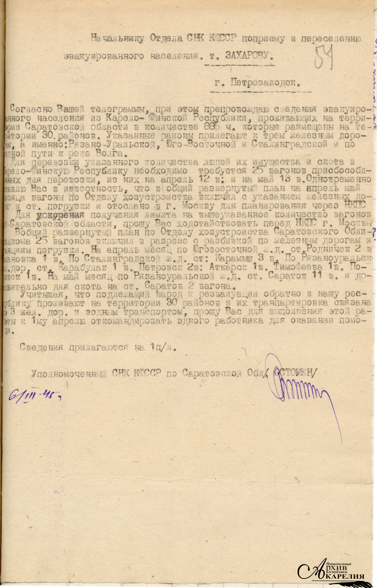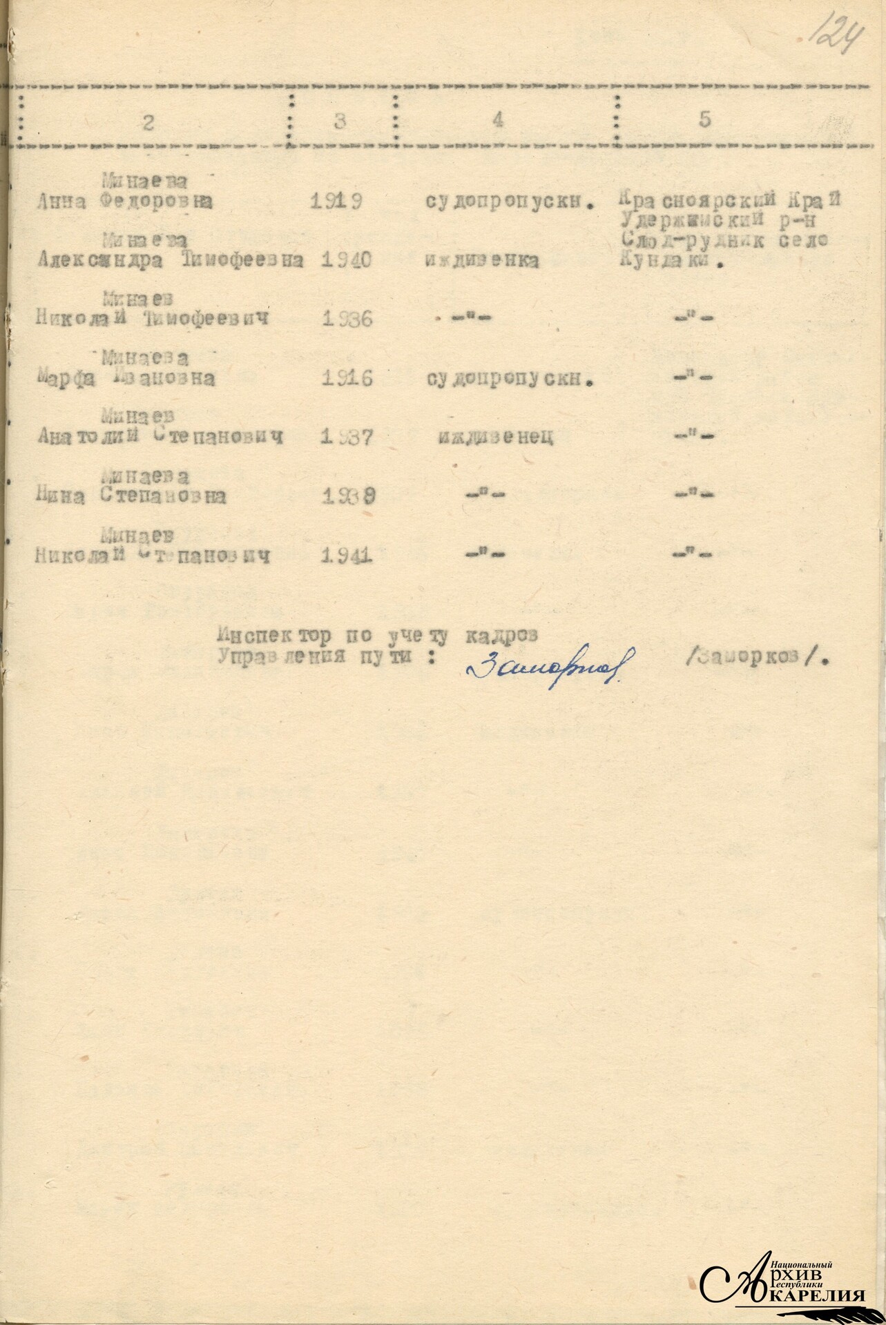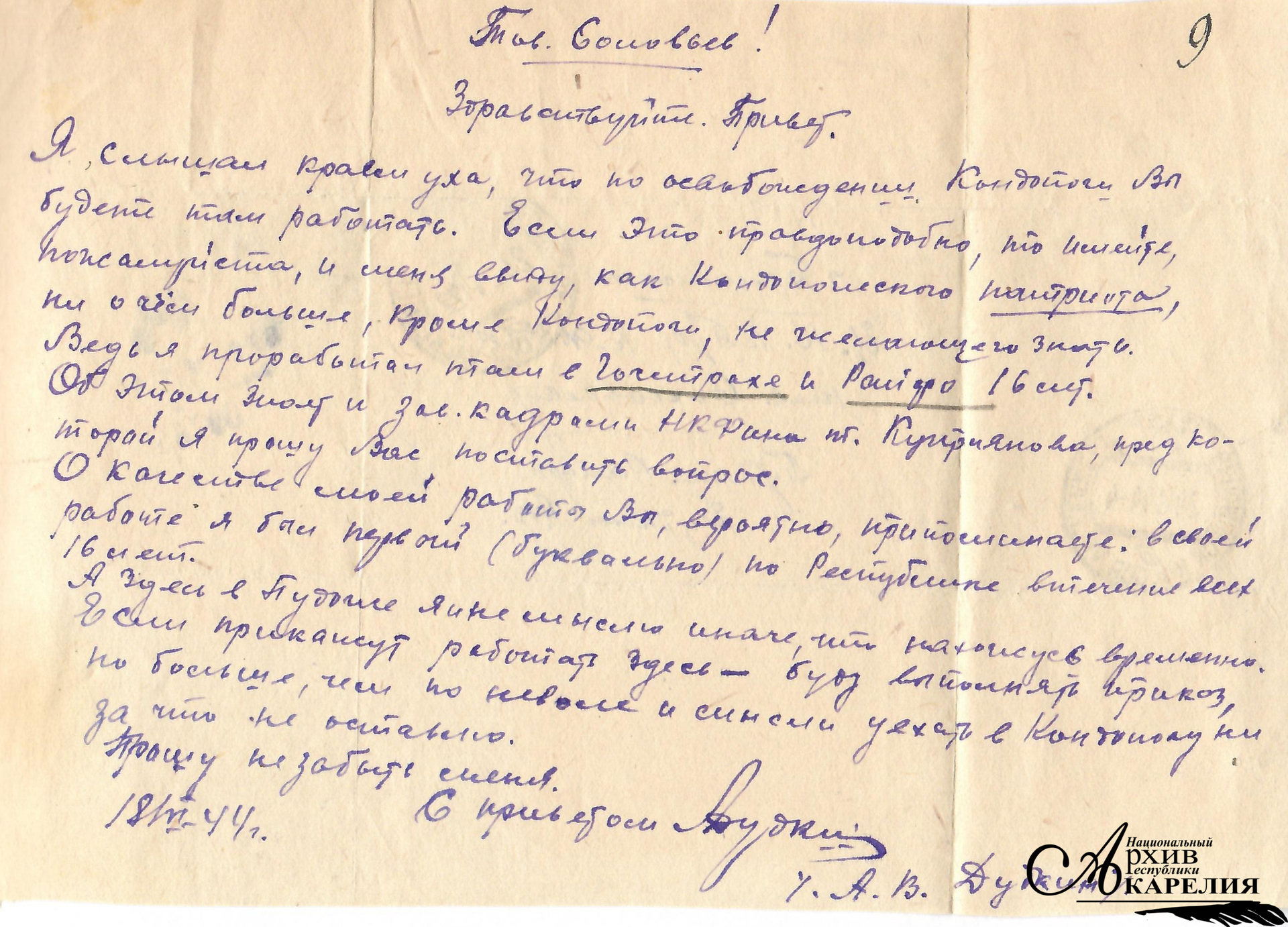 Список специалистов сельского хозяйства (агрономов, механиков, ветврачей), эвакуированных из КФССР и проживающих в Ярославской области, составленный уполномоченным СНК КФССР по Ярославской области Вайноненом для подготовки возвращения в КФССР.
