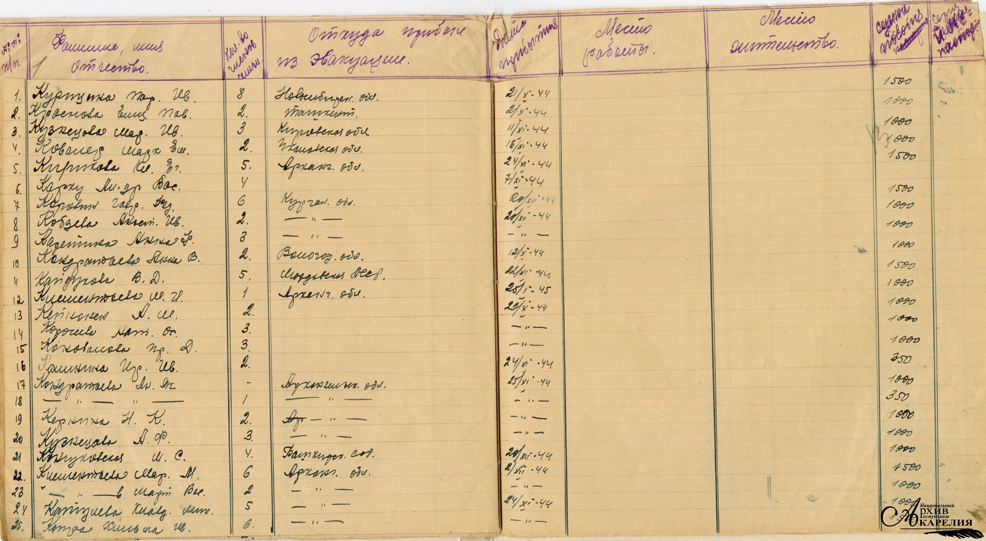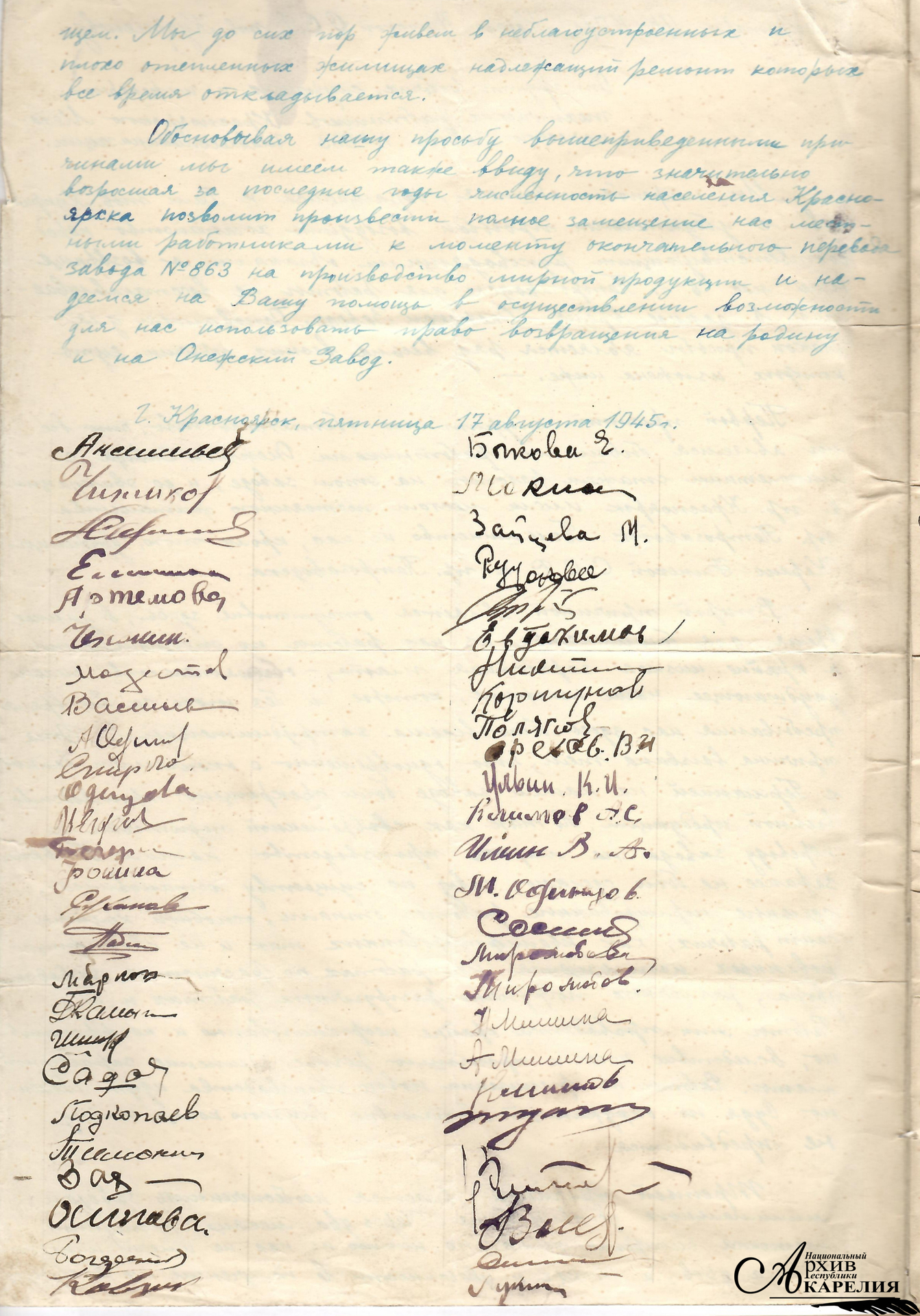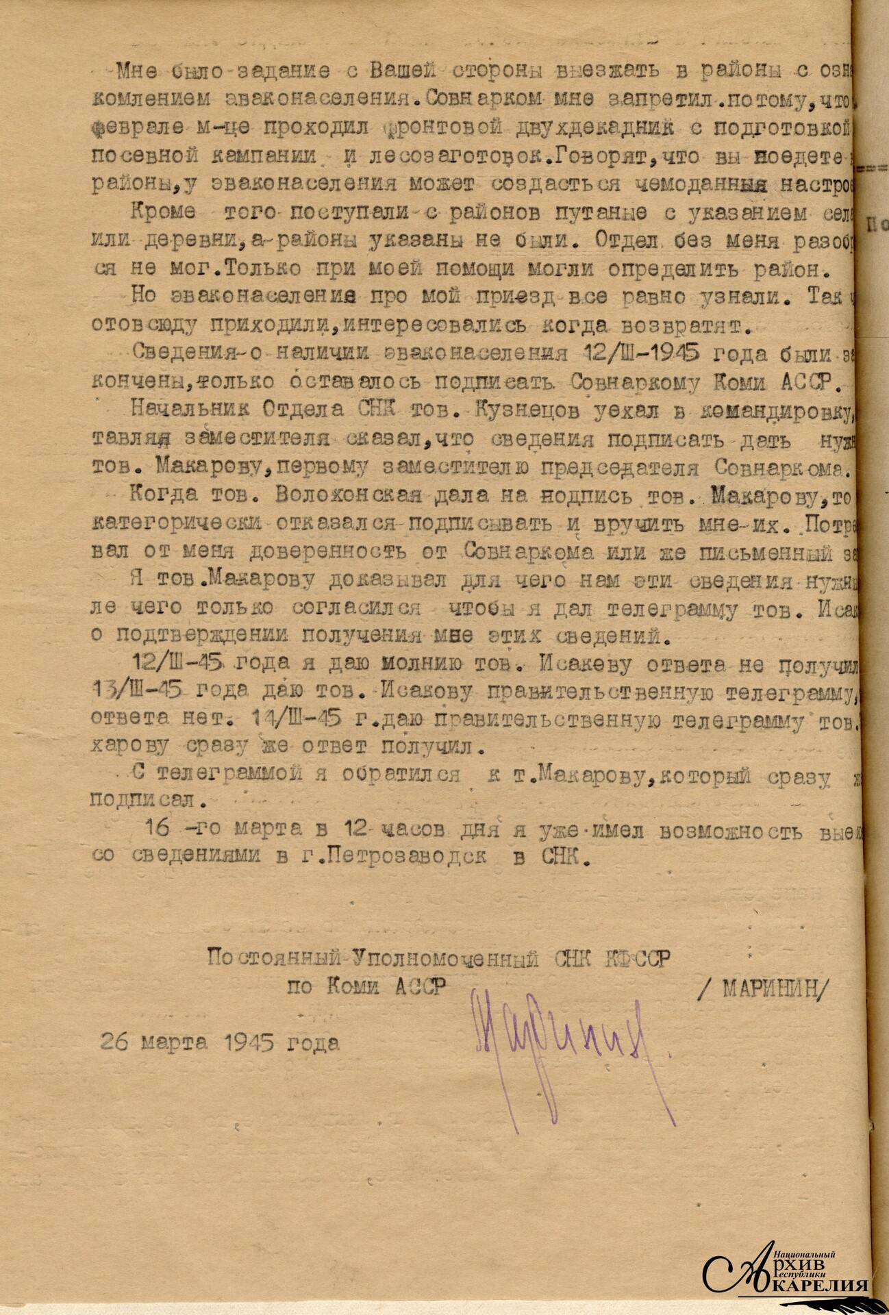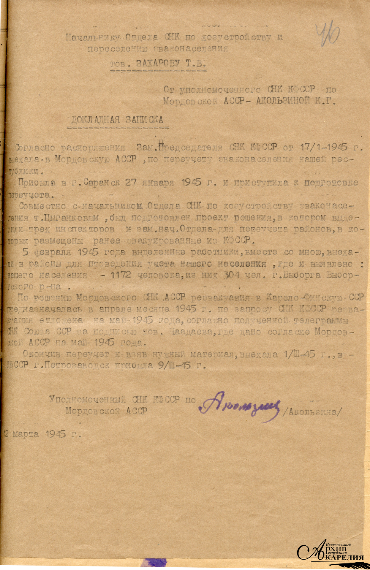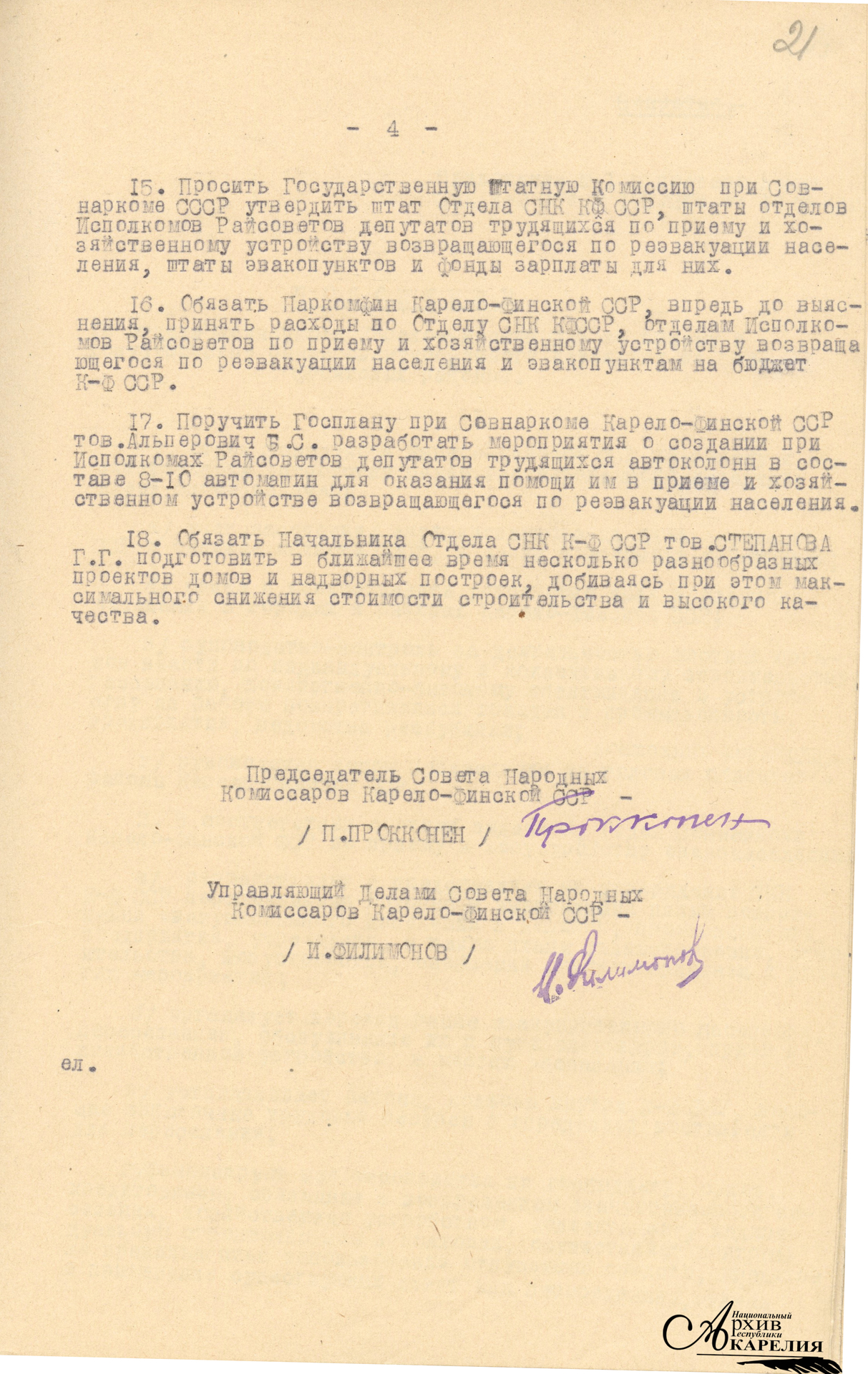 Список специалистов сельского хозяйства (агрономов, механиков, ветврачей), эвакуированных из КФССР и проживающих в Ярославской области, составленный уполномоченным СНК КФССР по Ярославской области Вайноненом для подготовки возвращения в КФССР.