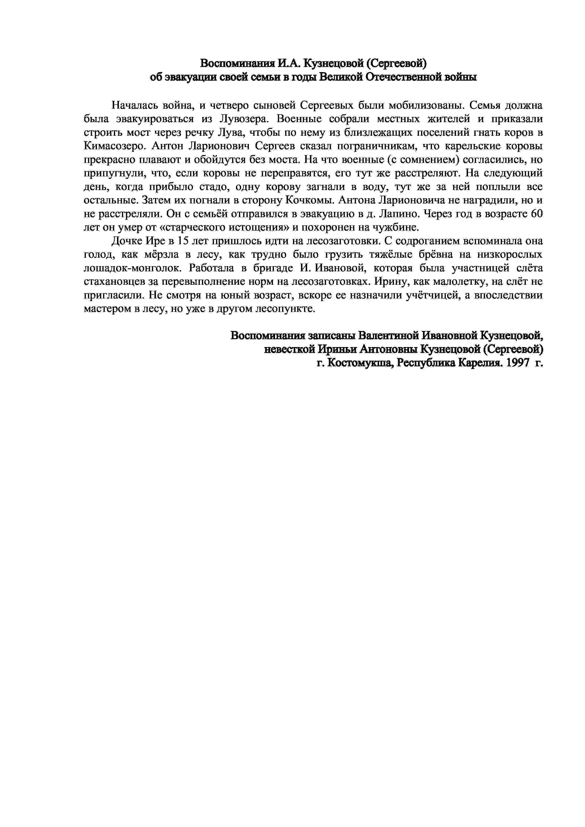 Материалы переданы Валентиной Ивановной Кузнецовой (г. Костомукша, Республика Карелия), невесткой Ириньи Антоновны Кузнецовой (Сергеевой).