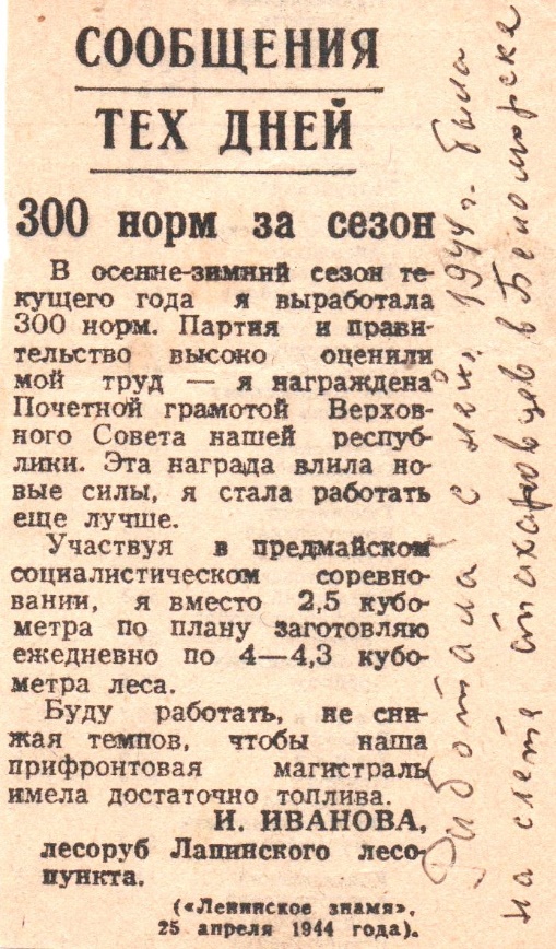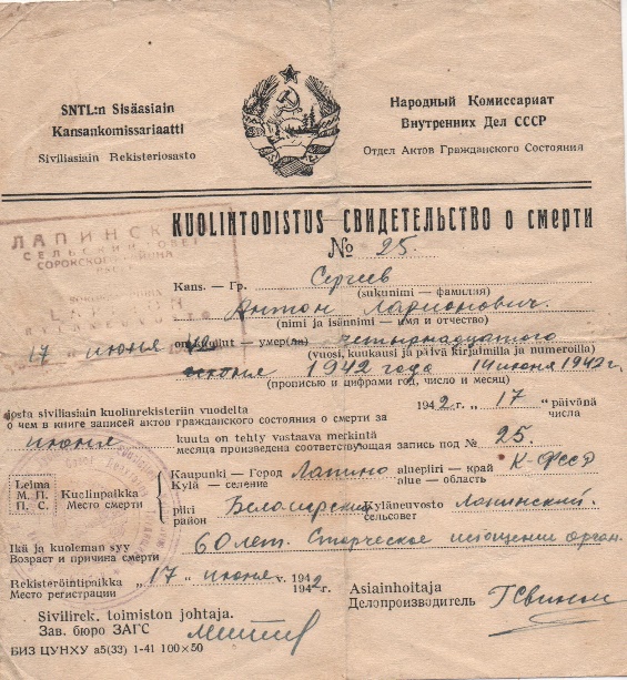 В 1941 г. семья была эвакуирована в д. Лапино Беломорского района.