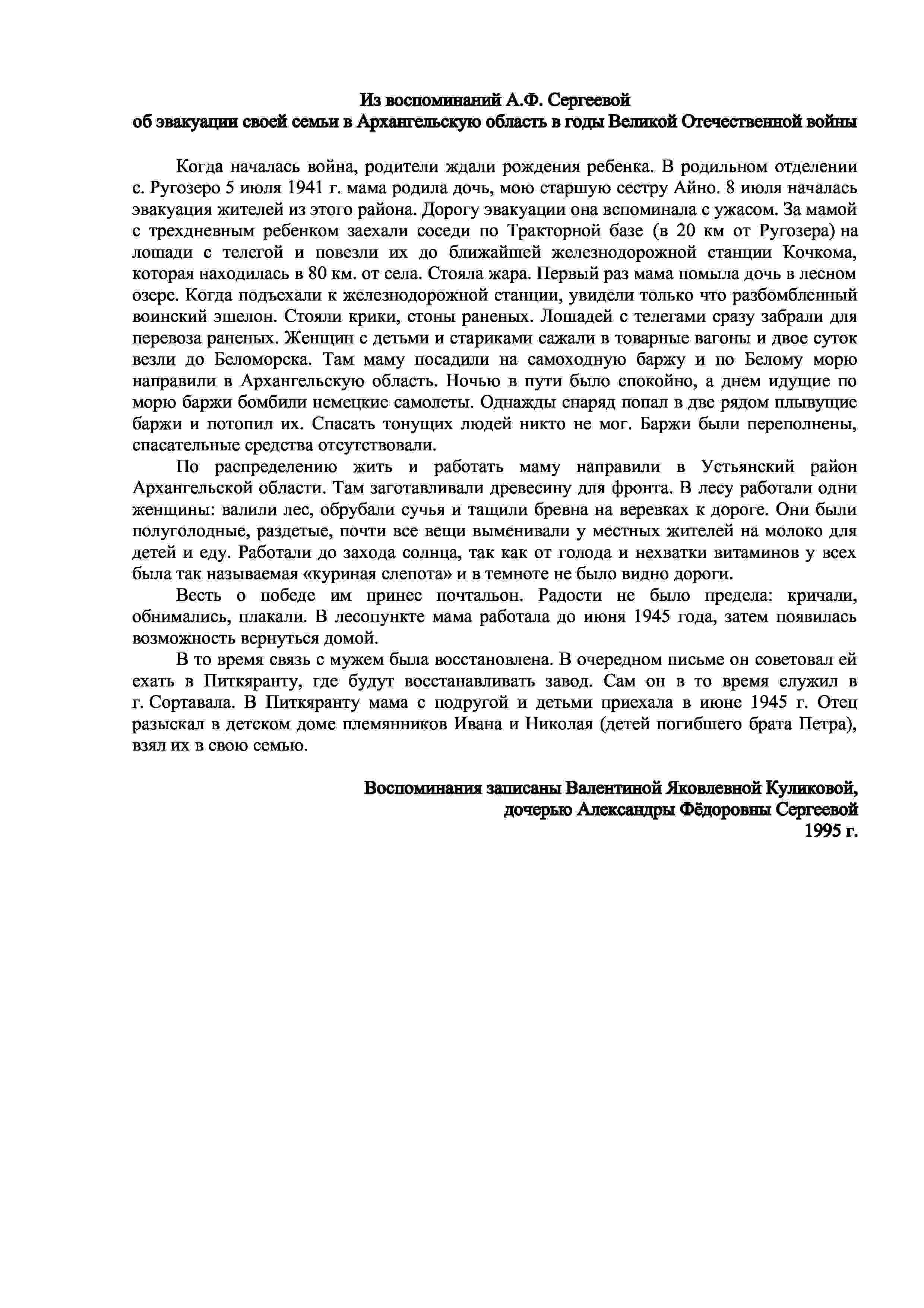 Материалы переданы Валентиной Ивановной Кузнецовой (г. Костомукша, Республика Карелия) и Еленой Ивановной Романовой