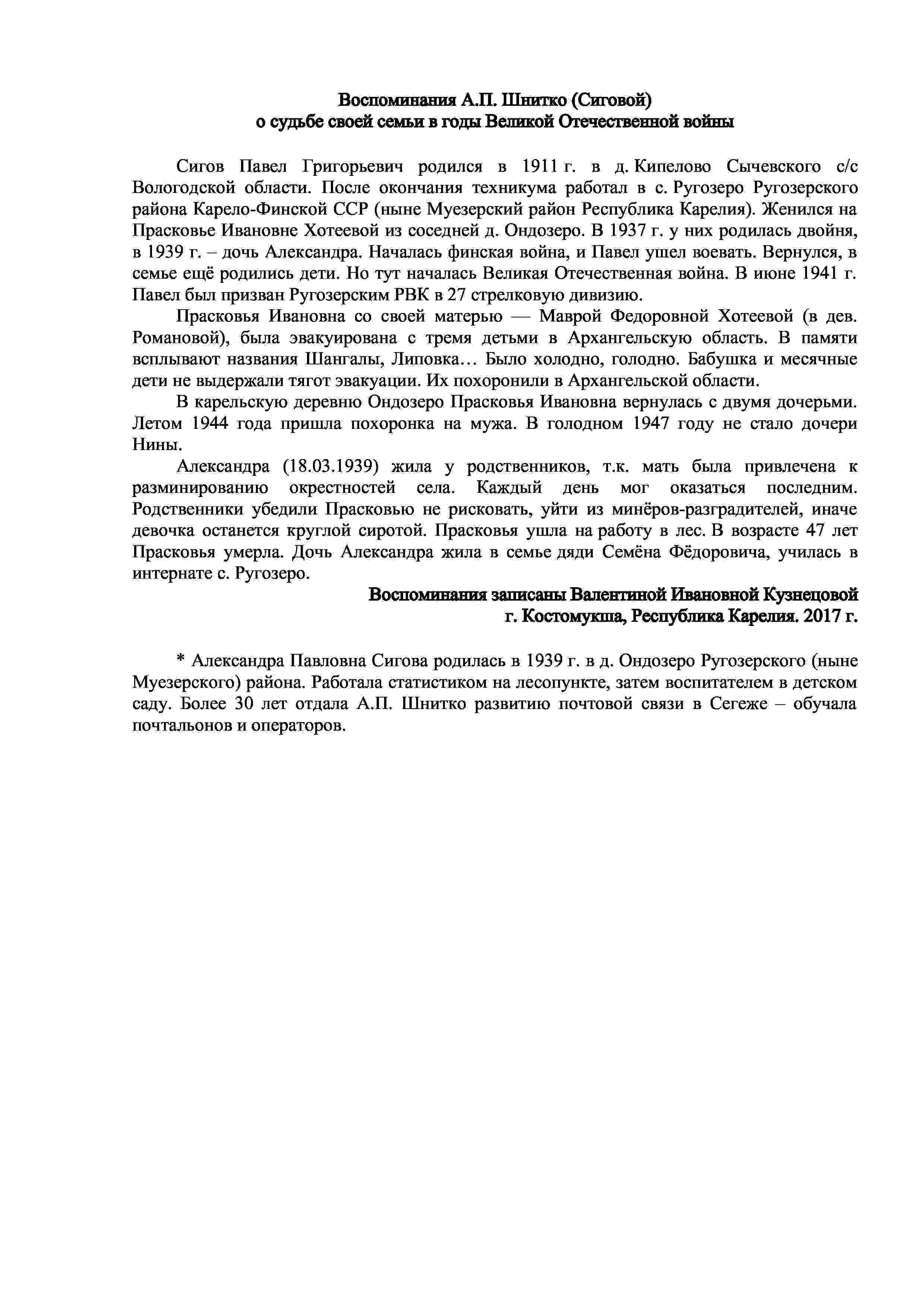 Материалы переданы Валентиной Ивановной Кузнецовой (г. Костомукша, Республика Карелия) и Еленой Ивановной Романовой