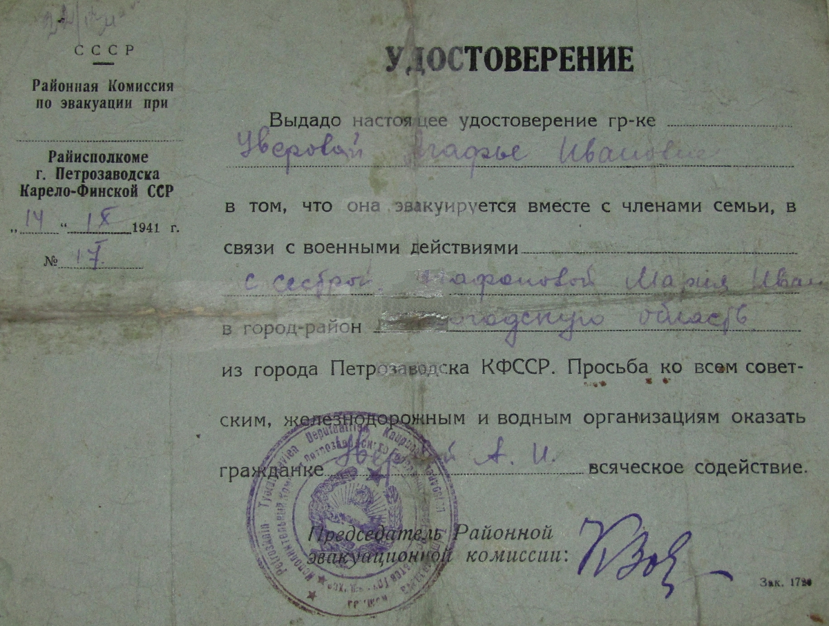 Агафья Ивановна Уверова (Агафонова) (1893 — 1970) до войны проживала в г. Петрозаводске, работала ученицей телеграфа, рассыльной на Мурманской железной дороге, курьером в «Южкареллесе», перед Великой Отечественной войной работала в совхозе № 1 г. Петрозаводска. В сентябре 1941 г. вместе с женой сына Александра Ивановича Уверова Анной Матвеевной Уверовой эвакуировалась в Андомский район Вологодской области, а в октябре 1941 г. — в д. Каршево Пудожского района, где они работали в пудожском совхозе № 2. После освобождения г. Петрозаводска эвакуировались обратно вместе с совхозом.