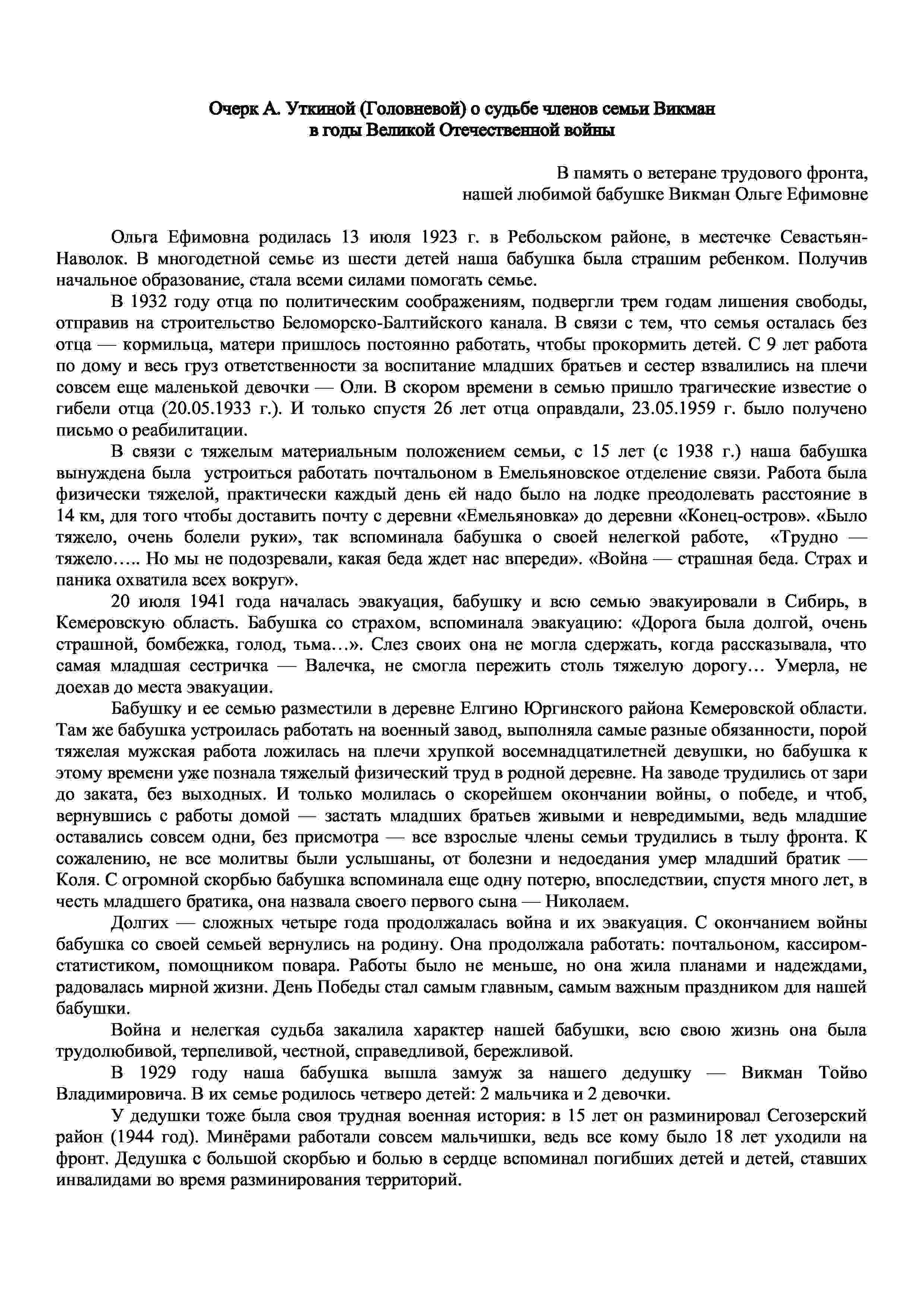 До Великой Отечественной войны семья Викман проживала в д. Севастьян-Наволок Ребольского района. В июле 1941 г. семья была эвакуирована в Сибирь — в д. Елгино Кемеровской области. После окончания войны вернулась на родину.